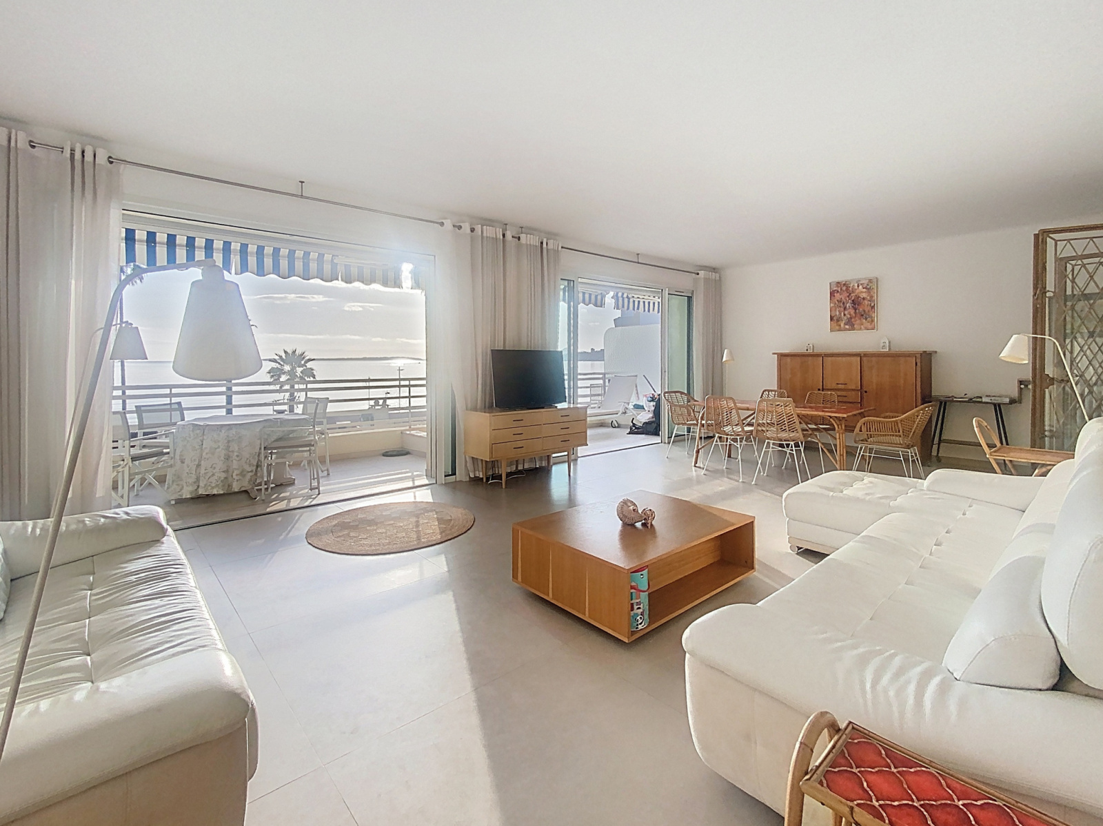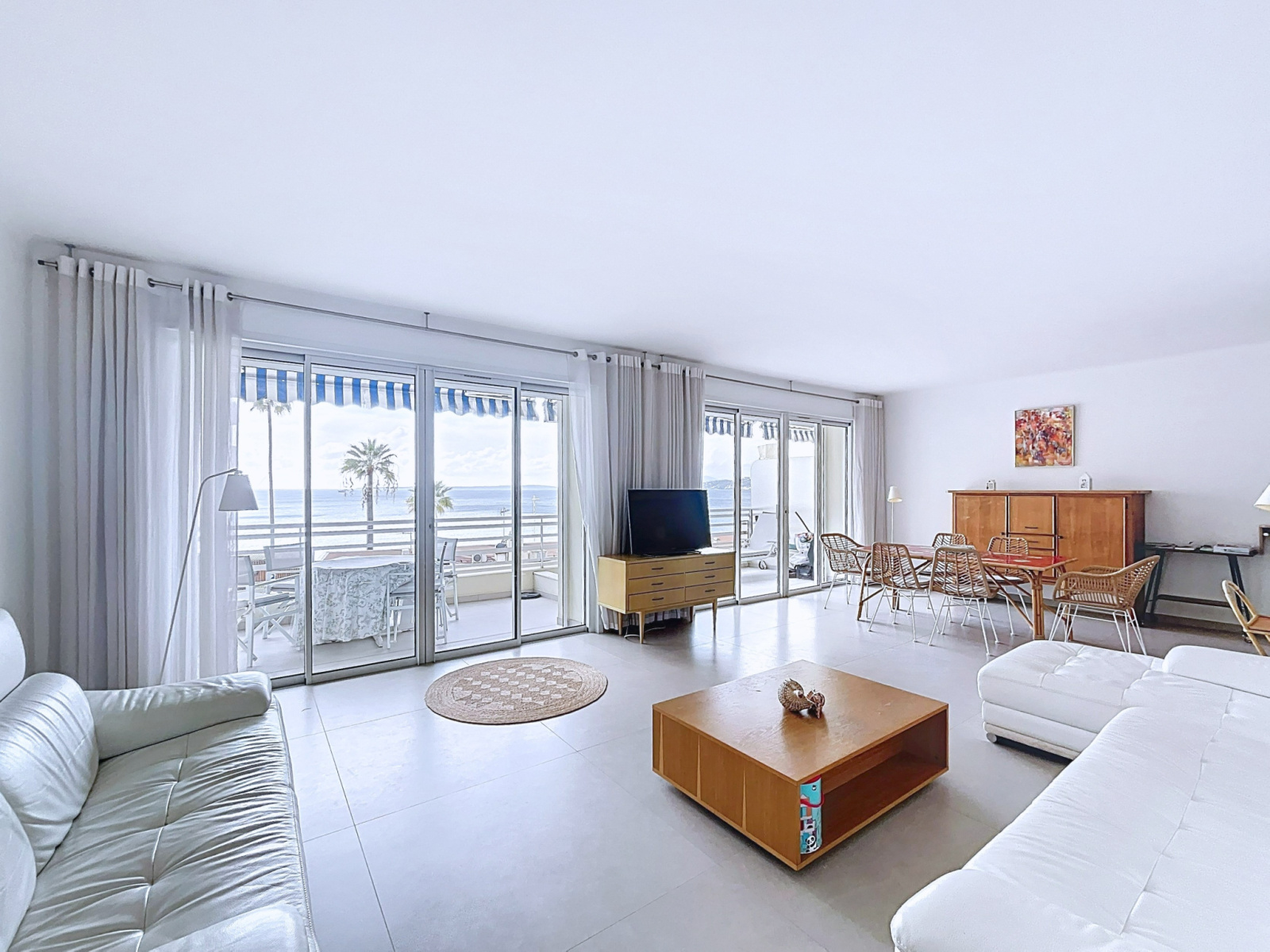 Planet Collection Agency is delighted to present this exceptional 5-room apartment offering 148.11 sqm of living space, enhanced by a magnificent 25.5 sqm terrace with panoramic sea views over the Lérins Islands and the Pointe de la Croisette. Ideally located on the seafront in Juan-les-Pins, just steps away from beaches, shops, schools and public transport, this outstanding property is set within a secure, high-end residence with caretaker.The apartment impresses with its generous volumes, abundant natural light, and perfectly designed layout. It features a spacious contemporary kitchen, fully fitted and equipped, a refined 40 sqm living room opening onto the south-facing terrace, offering an exceptional Mediterranean lifestyle. The night area comprises four elegant bedrooms, including two en-suite suites with private shower rooms and toilets, ensuring privacy and absolute comfort. High-quality features include reversible air conditioning, a large custom-made walk-in dressing room, ample built-in storage, a guest toilet, and a third shower room with toilet. A secure private parking space with numbered owner badge completes this rare and exclusive property. Subject to co-ownership regimes. Annual Fees : 4800 € - Salers fees included.
