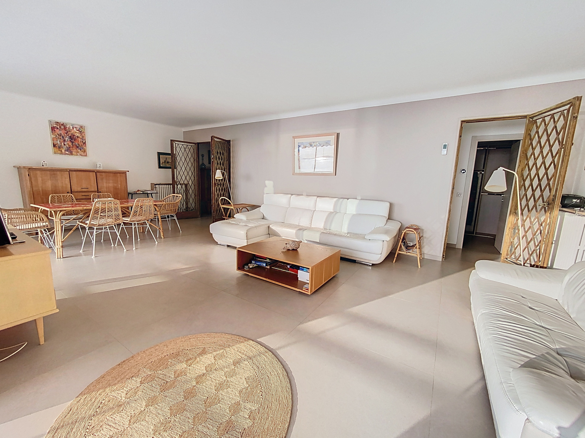 L’agence Planet Collection est ravie de vous présenter ce somptueux appartement de 5 pièces d’une superficie de 148,11 m², agrémenté d’une superbe terrasse de 25,5 m² offrant une vue mer panoramique sur les îles de Lérins, la pointe de la Croisette et le massif de l’Esterel. Idéalement situé en bord de mer à Juan-les-Pins, à quelques pas des plages, des commerces, des écoles et des transports, ce bien d’exception se trouve au sein d’une résidence sécurisée de standing avec gardien. L’appartement séduit par ses volumes généreux, sa luminosité remarquable et son agencement parfaitement pensé. Il comprend une vaste cuisine contemporaine entièrement aménagée et équipée, un séjour élégant de 40 m² ouvrant sur la terrasse exposée plein sud, véritable belvédère sur la Méditerranée. L’espace nuit offre quatre chambres raffinées, dont deux véritables suites avec salles d’eau et toilettes privatives, garantissant intimité et confort absolu. Les prestations haut de gamme complètent ce bien : climatisation réversible, grand dressing sur mesure, nombreux rangements intégrés, WC invités ainsi qu’une troisième salle d’eau avec toilettes. Un parking sécurisé avec badge propriétaire numéroté vient parfaire ce bien rare et recherché. Soumis au régime de copropriété. Charges annuelles 4800 euros. Honoraires compris à la charge du vendeur.