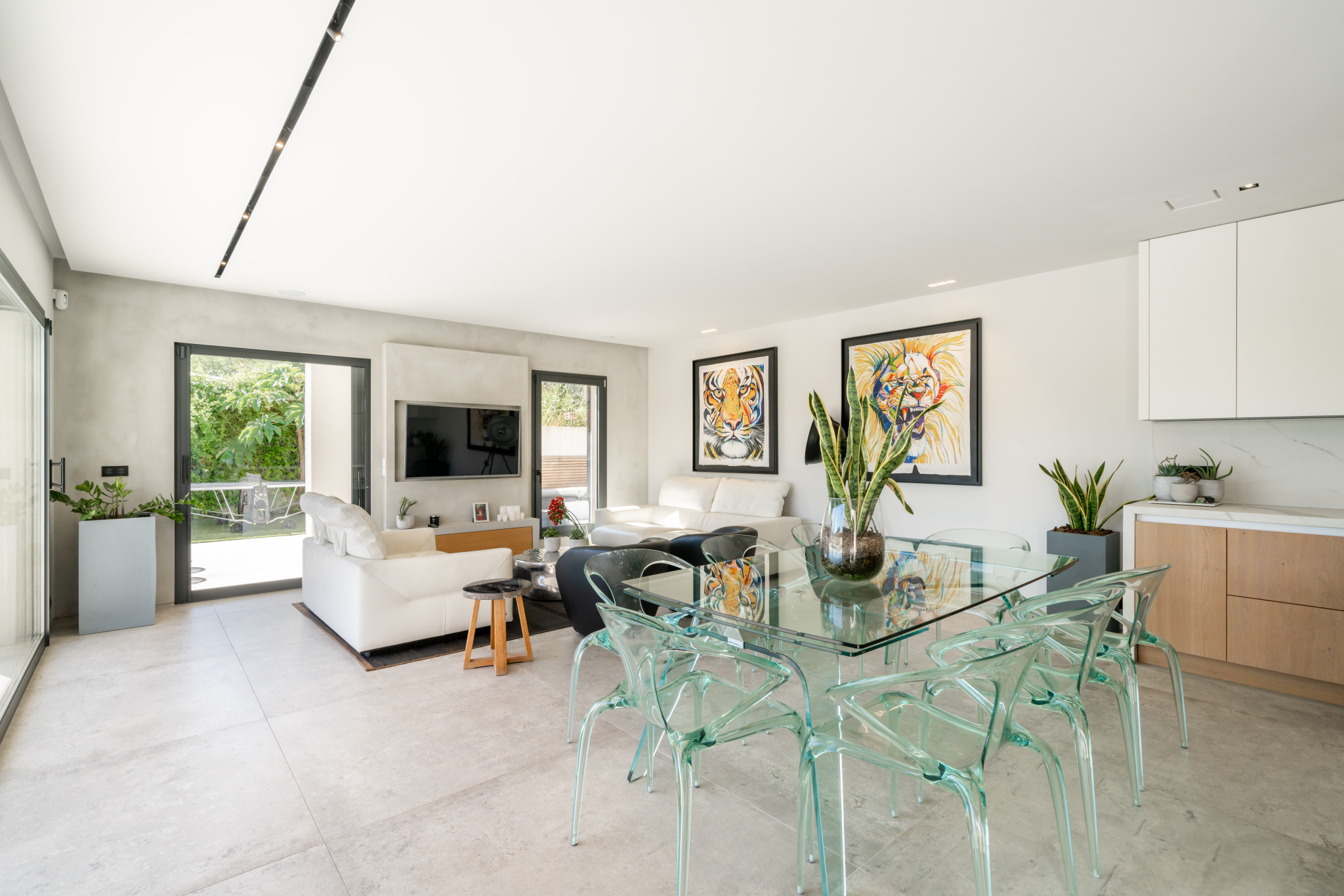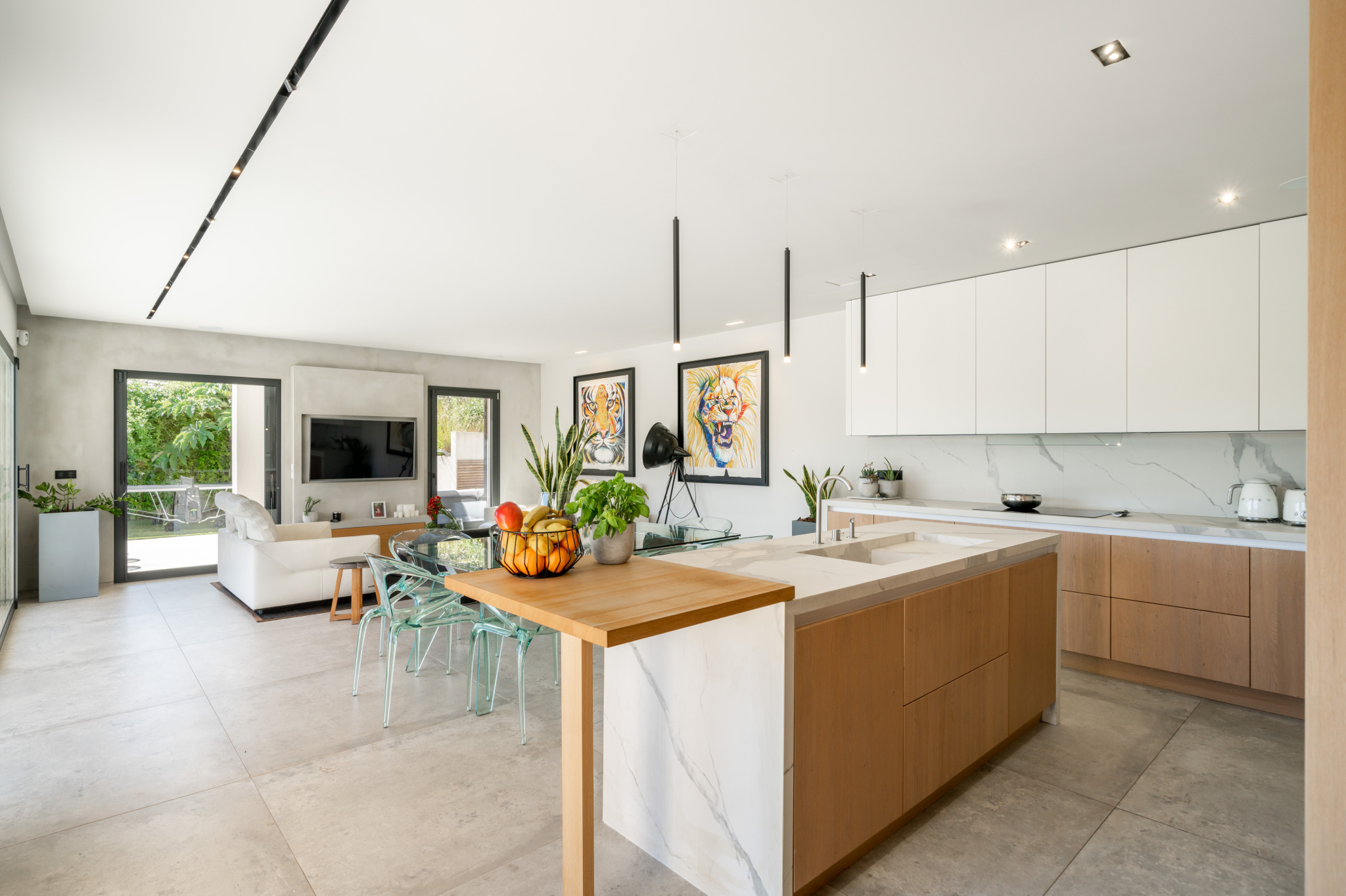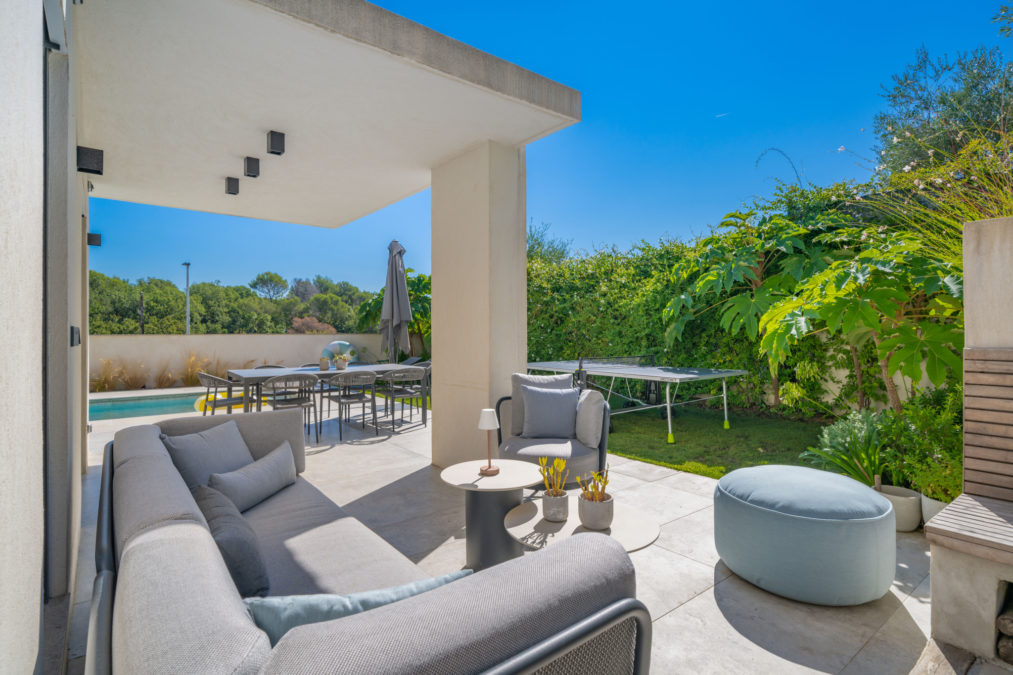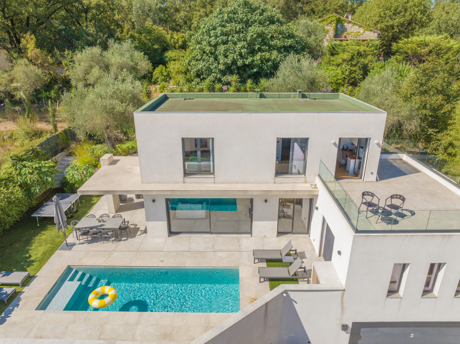 - Premier étage : une chambre avec salle d’eau attenante, une belle pièce de vie lumineuse avec cuisine américaine équipée, donnant directement sur l’extérieur avec piscine, terrasse ensoleillée et agréable jardin.