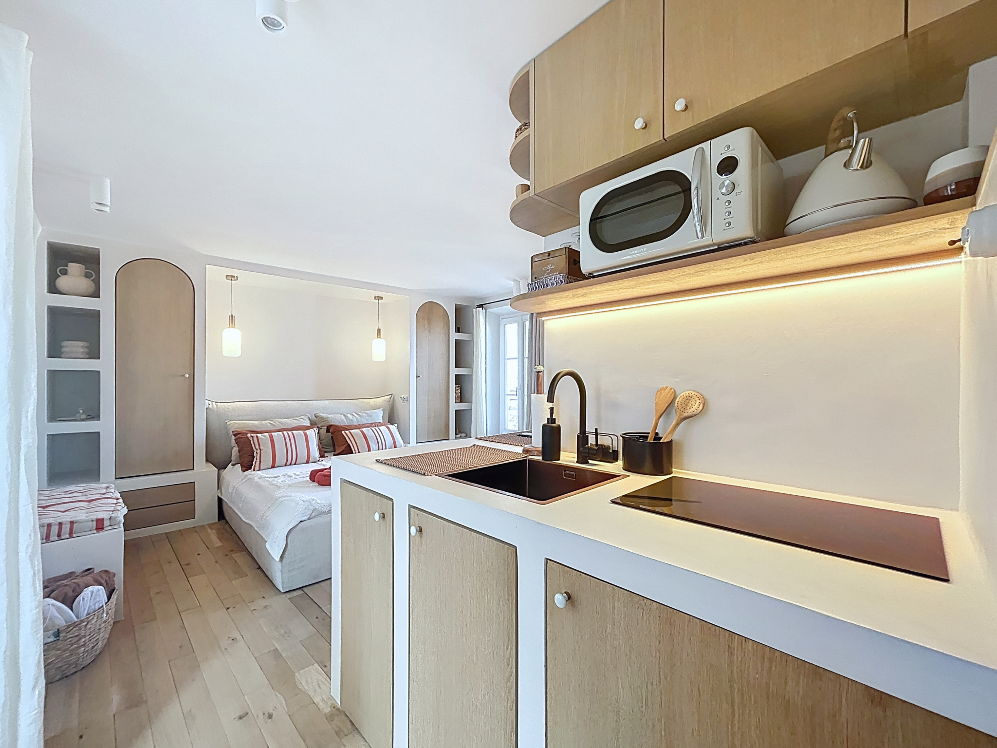 Vous y trouverez une cuisine américaine entièrement équipée, une pièce de vie avec rangements, ainsi qu’une salle de douche attenante.