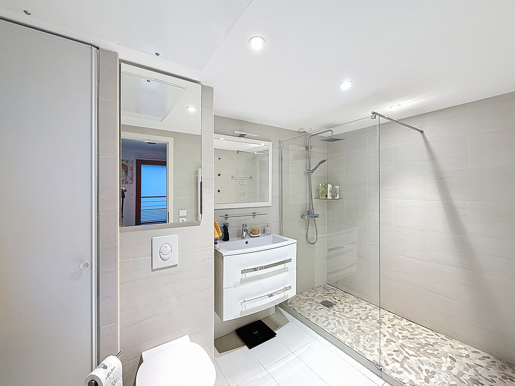 L’espace nuit propose une chambre élégante avec accès à un second balcon, véritable cocon de tranquillité. Une salle de douche au design moderne avec WC, aux finitions actuelles, complète l’ensemble.