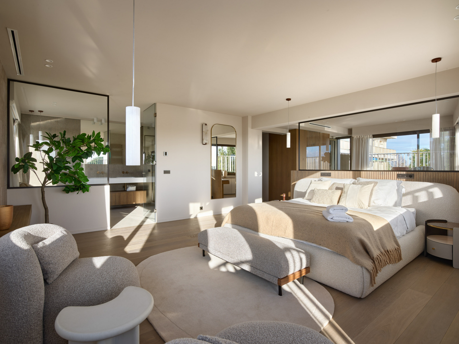 Le mobilier, soigneusement sélectionné, se compose de pièces design sur mesure importées d’Italie, soulignant l’élégance et le raffinement de l’appartement.